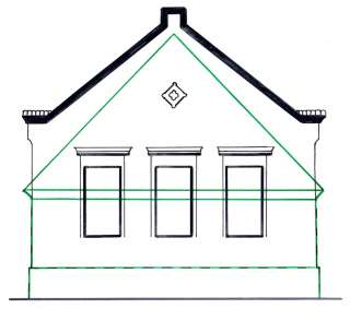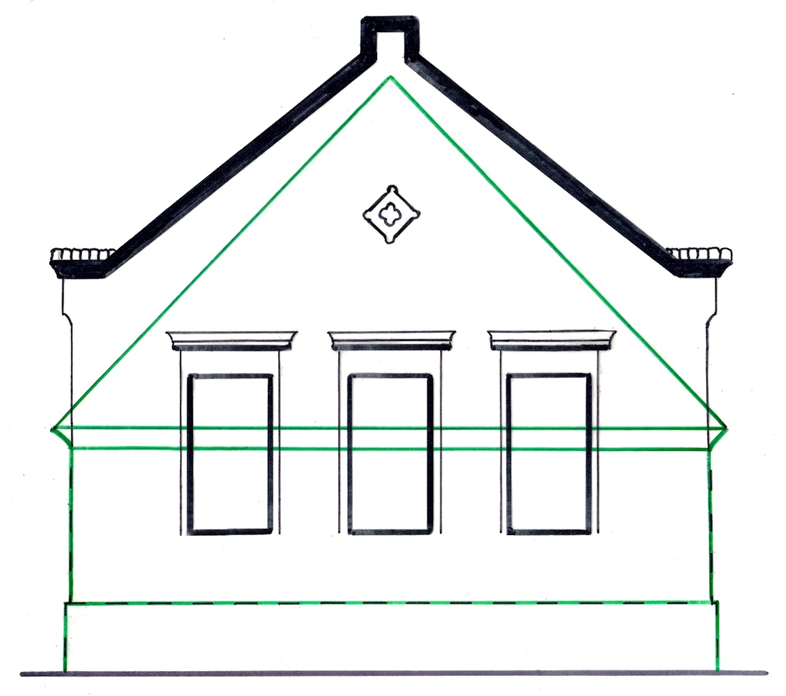 (Zölddel a korábbi, feketével az átépítés utáni utcai homlokzat. Szaggatott vonal jelzi az előbbiből meghagyott részeket.)
