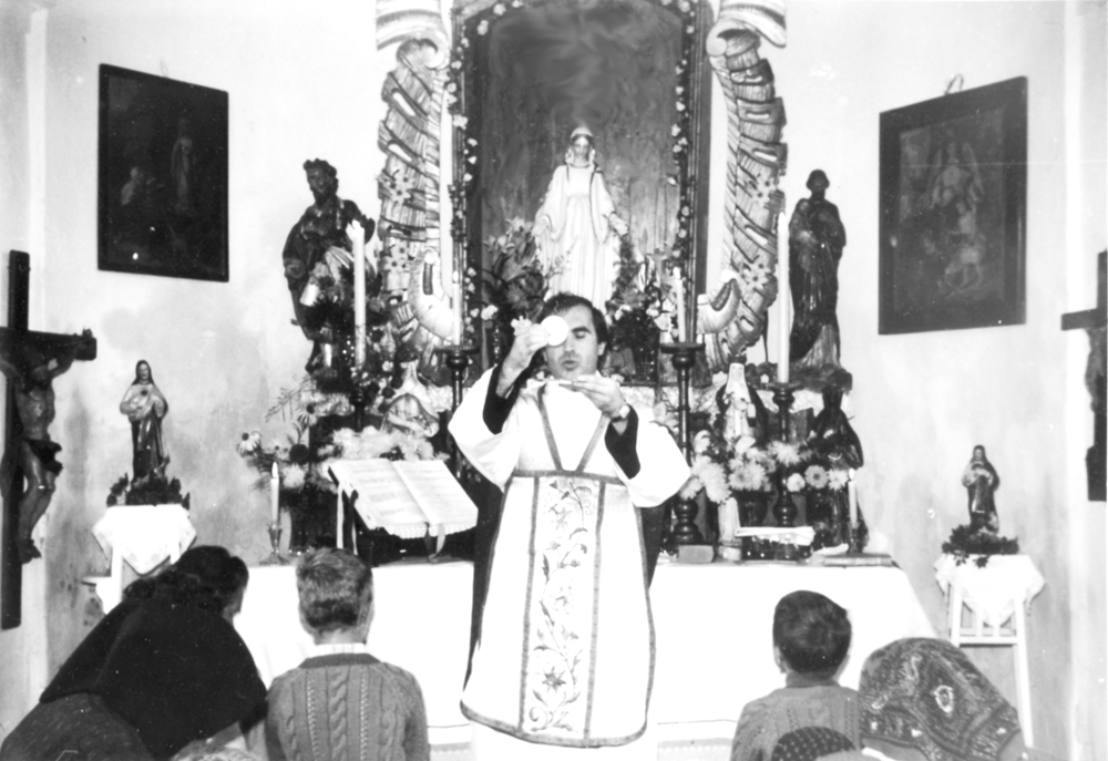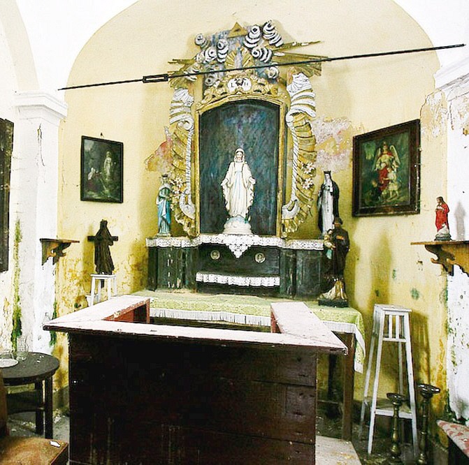(Az oltár két oldalán szentek nagy, fából faragott szobrai állnak. E két eredeti szobor mára eltűnt. Ugyan nem gondolom, hogy bárki valamiféle csodára gyanakodna, mégis megfogalmazom a tényt kevésbé szégyenlősen is: több mint kétszáz év és világháborúk után eltulajdonításra kerültek. Időközben Pete Zsolt révén megtudtam, hogy emlékei szerint 1996 körül betörtek a kápolnába. Péter illetve Pál apostol szobrát akkor lopták el.)