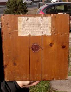 Az ereklyetartó hátsó lapján az ereklyét tartalmazó mélyedést fából készült lappal fedték, amelyet pecséttel rögzítettek. Mellette egy papírlapon a következő nyomtatott szöveg olvasható: