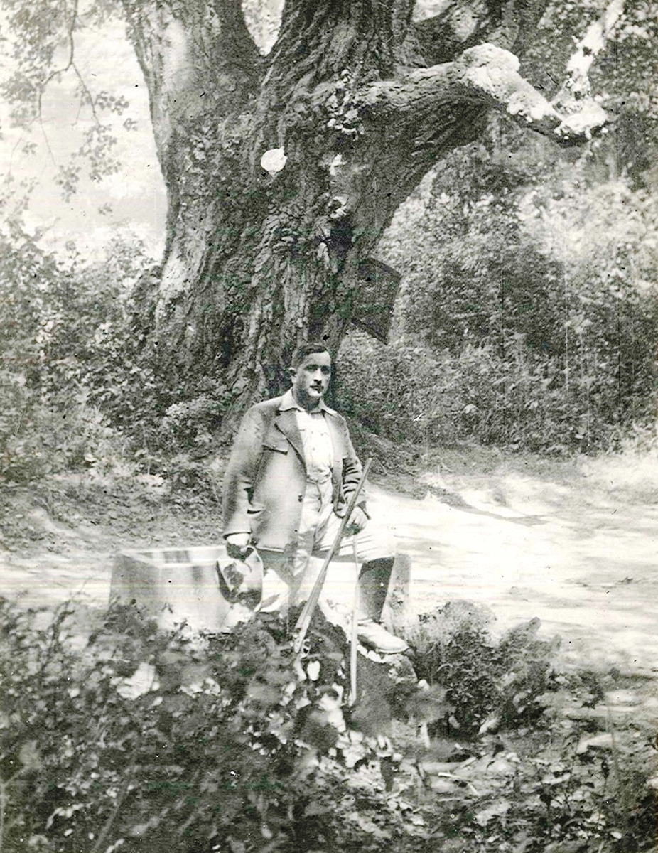 (A Hajdu Józsefné tulajdonában lévő képen Kenessey István, a környék 1897-ben született erdésze. Mögötte a vén nyárfán valamelyest látszik Szűz Mária képe, amelyet a hívek helyeztek oda.)
