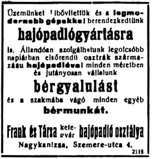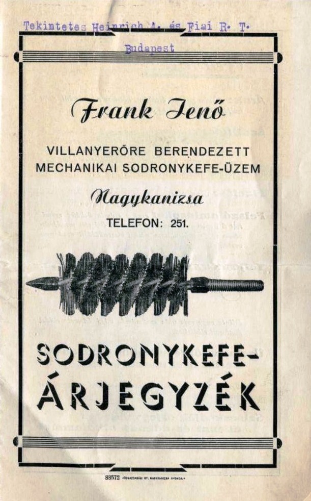A későbbiekben Frank beindította „sodronykefe” (drótkefe) üzemét is. Nem világos, hogy az egység hol működött: itt, vagy a gyáros lakóingatlanán (Zrínyi utca 34.).
