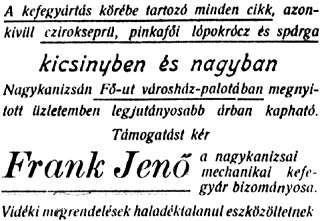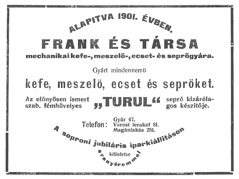 Az első világháború alatti tulajdonosváltozás után Frank Jenő kefekereskedő és társa működtette tovább a gyárat.