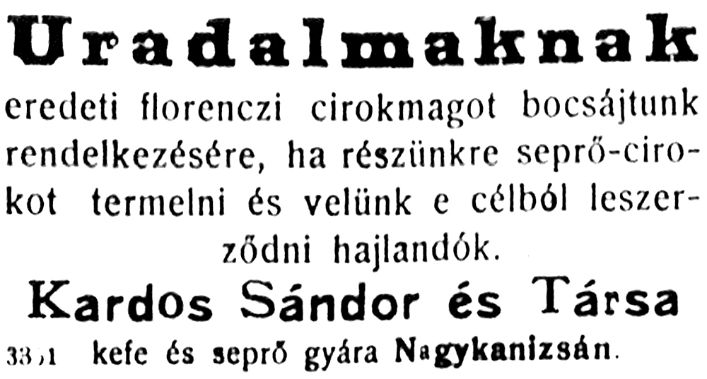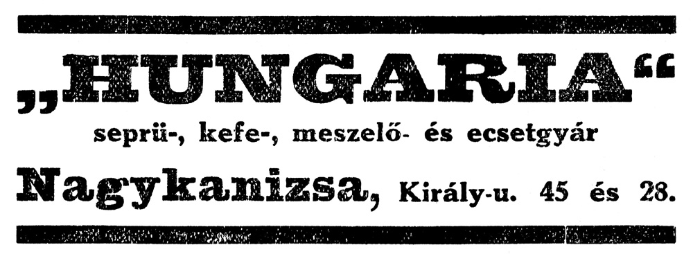 •1920-tól termelt egy másik, kisebb üzem is a városban, amely seprűk, kefék, ecsetek, esernyők gyártásával foglalkozott, „Hungária seprő-, kefe-, meszelő- és ecsetárugyár” néven. Az 1919-es alapítói közül Kreiner Gyula (hatvan évesen, 1922-ben halt meg) kereskedő és Wolf Lipót (ötvenkilenc esztendősen, 1927-ben hunyt el) személyéről tudok. Bérelt helyiségekben működött; e helyen is.