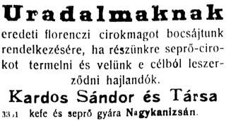 •Kardos Sándor 1901-ben alapított, az Ady utca 6. szám alatt működő, kisipari cége fokozatosan bővítette termelését és dolgozói számát.