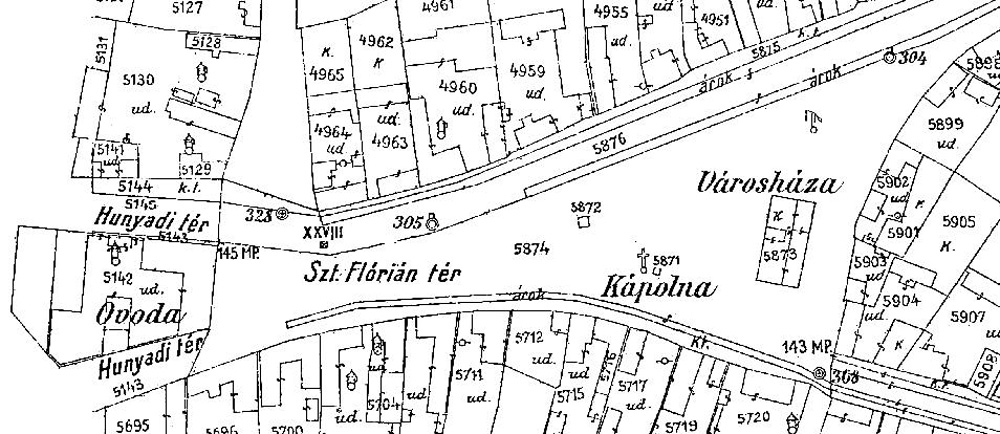 (Jobbra az ingatlan Szent Flórián tér felőli oldala.)