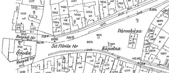 •Az előző képeslapon látható épületek együttesét nevezték Városházának. Már az 1864-es térképen is megtaláljuk, de csak az 1917-es és későbbi változatokon szerepel e néven.
