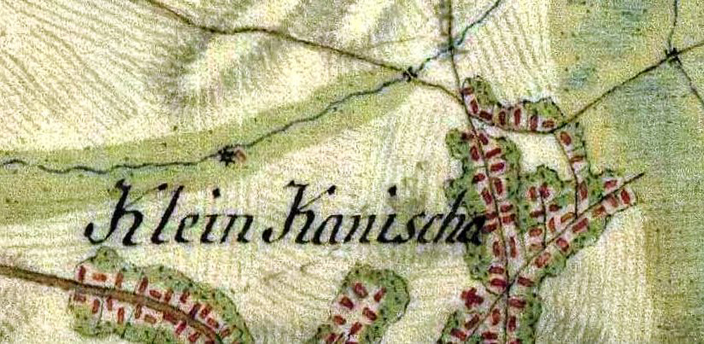 Alul zöld mezők, dombhátak (egyikükön nyárfasor) között látszott a régi Kiskanizsa. Házai között a festő egy régebbi, kopottas (égettnek látszó), ma már nem létező kápolnát is ábrázolt.