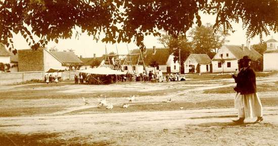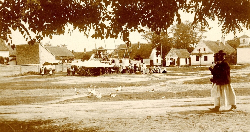 (A fotó valószínűleg a városrész búcsújakor készült. A háttérben balra a Városháza épületegyüttesének nyugati oldala. Előtte egy hajóhinta, attól balra a mézeskalácsos fehérlő, nagy sátra. Középen, a hintánál csoportosulók mögött az uradalom – vendéglőként hasznosított – 5. házszámú saroképülete.)