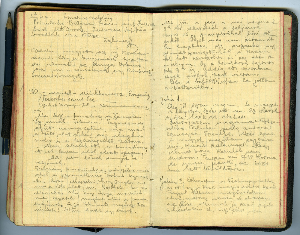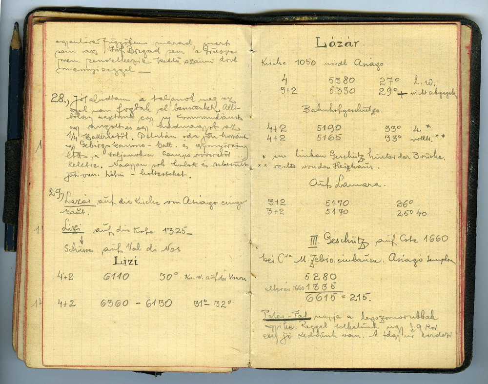 Én maradtam tovább és ők is lőttek tovább. 12 h délben kezdett alábbhagyni. Az alezredes parancsára egy megfigyelőhelyet (?) kell keresnem, ahonnan látom a Monte Nost. Találtam, de épp olyan exponált hely, mint ez. Onnan már elszöktek a 22-es tábori ágyús (?) urak.
