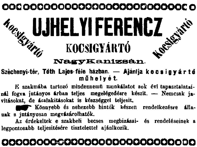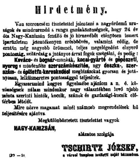 •A tér sarkán álló (oromfalával a térre néző) alacsony házban működött – 1868-as adat szerint – Tschirtz (más források szerint Tschürtz) József bognár, kovács és kocsigyártó műhelye. Már 1845-ben is Kanizsán dolgozott és e házat birtokolta.