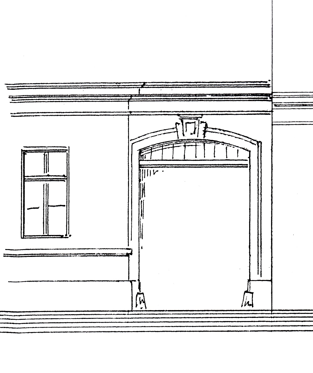 (Az épület emeletes része egy lakásnak adott helyet. A kapubejáró két oldalához egy-egy kis gabonaraktár csatlakozott. Bejáratuk a térre nyílt.