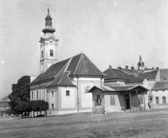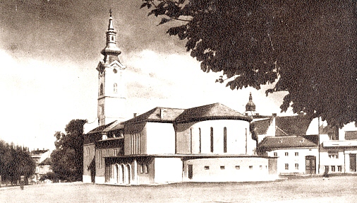 (A templom mögött – közvetlenül jobbra – az alacsony emeletes ház.)