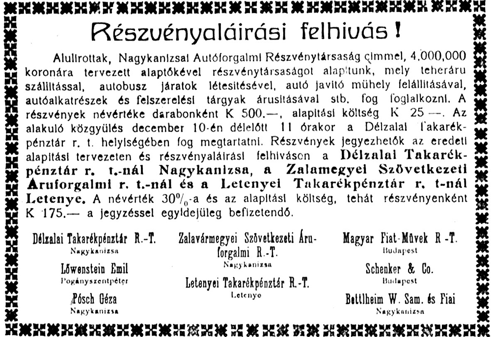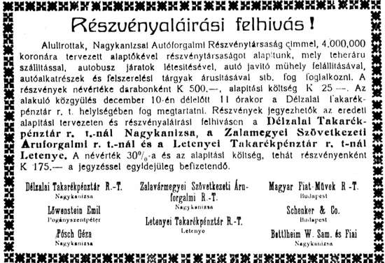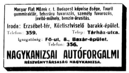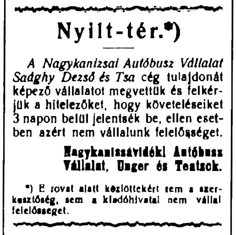 •1927-től a – Sághy (Saághy) Dezső által vezetett – Nagykanizsai Autóbusz Vállalat már három (32 férőhelyes, sárga) buszt is közlekedtetett.
