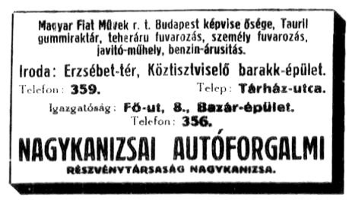 •A személygépkocsik kölcsönzésével, áruszállítással foglalkozó Nagykanizsai Autóforgalmi Rt. 1921-től működött; garázsai, műhelyei itt voltak.