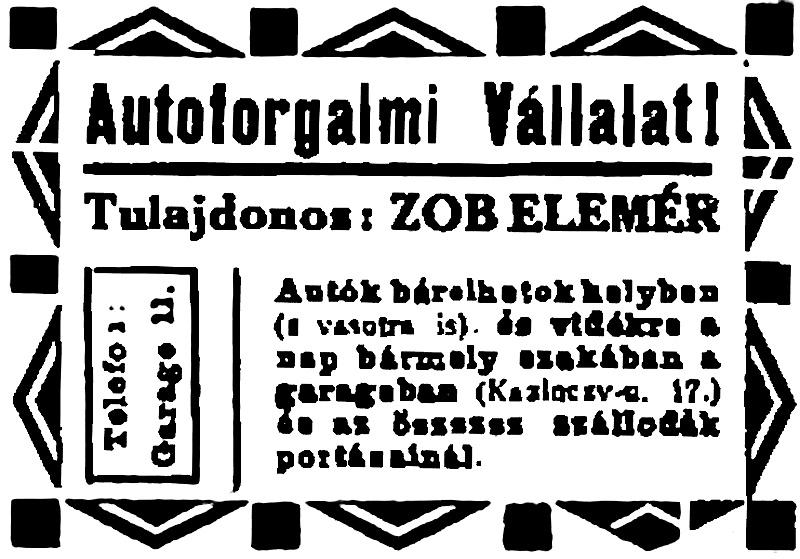 •Az első világháború után hozta létre Zob Elemér nyugalmazott százados Autóforgalmi Vállalatát.