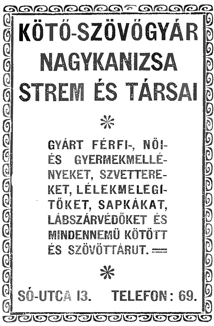 „Kötő-szövőgyár Nagykanizsa Strém és társai” (a társak száma hét volt),