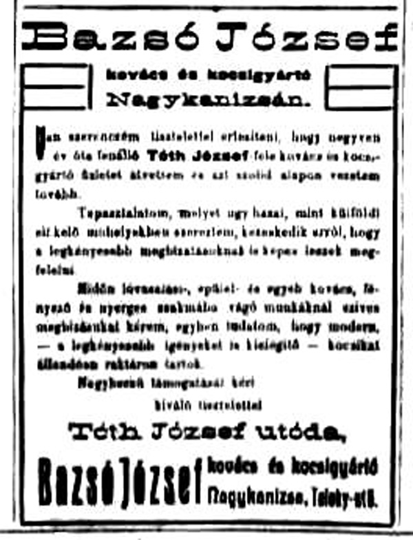 •1908-ban a műhelyt átvette Bazsó József (1879-1962) és megszerezte a ház tulajdonjogát is.
