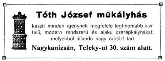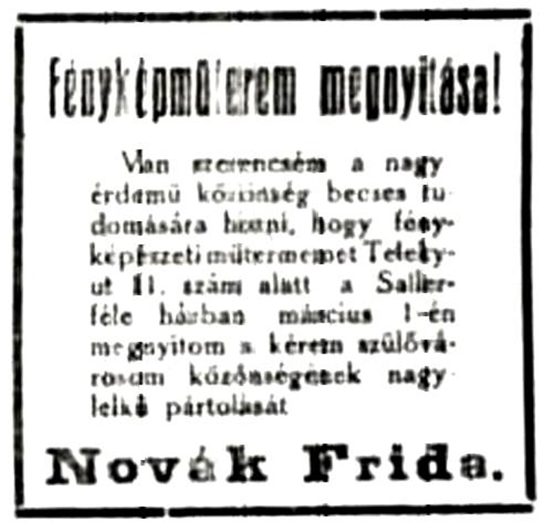 •1916-ban hirdette műtermének itteni megnyitását Novák Frida fényképész.