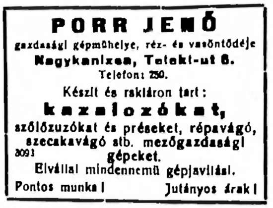 •Mint az alábbi hirdetésből is látható, 1931-ben itt ajánlotta szolgálatait Porr Jenő (hatvannégy évesen, 1937-ben halt meg) gépészmérnök. Egyszerű mezőgazdasági gépeket kínált.