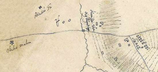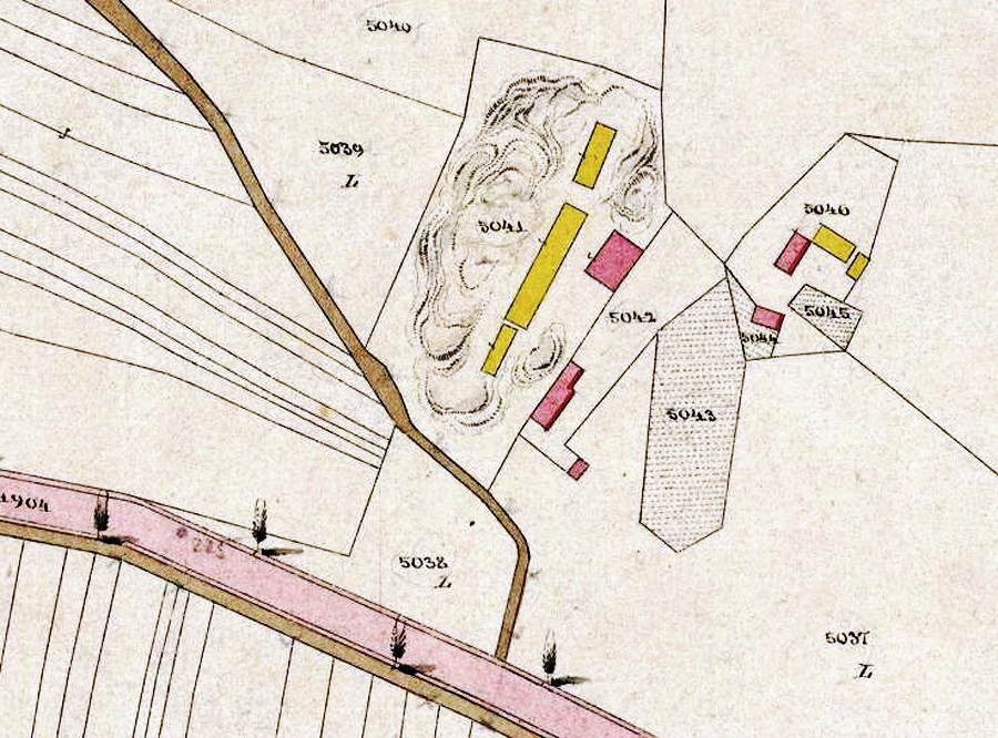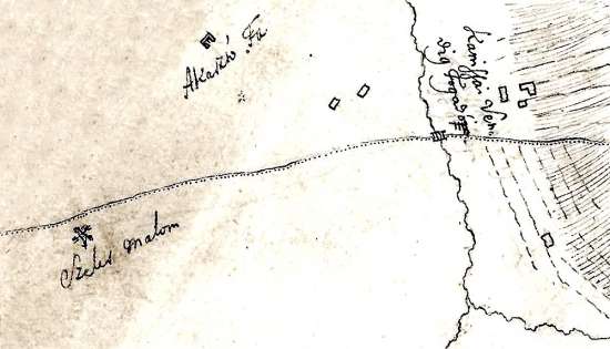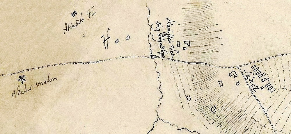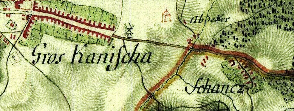 A szélmalom, az akasztásokat végző sintér (Abdecker) háza és közelében a vesztőhely jele (piros gúla három lábbal) az 1786-os térképen