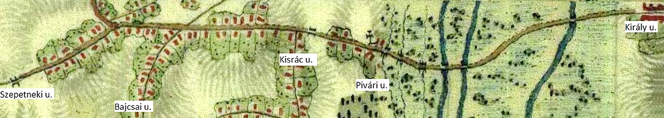 Az utca elején álló, 1925-ben emelt fogadalmi kereszt helyén az 1786-os térkép is (fából készült) keresztet jelez