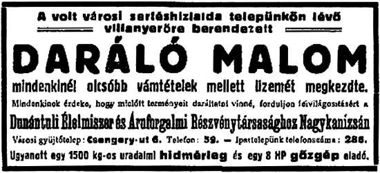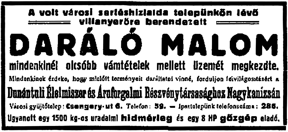 •A létesítmény gazdái cserélődtek, közben 1920-ban (ekkor Breuer Izidor volt a tulajdonosa) az élelmezési gondok enyhítéséhez a város használta, bővíttette is. 1921-ben került a Dunántúli Élelmiszer és Áruforgalmi Részvénytársaság birtokába.