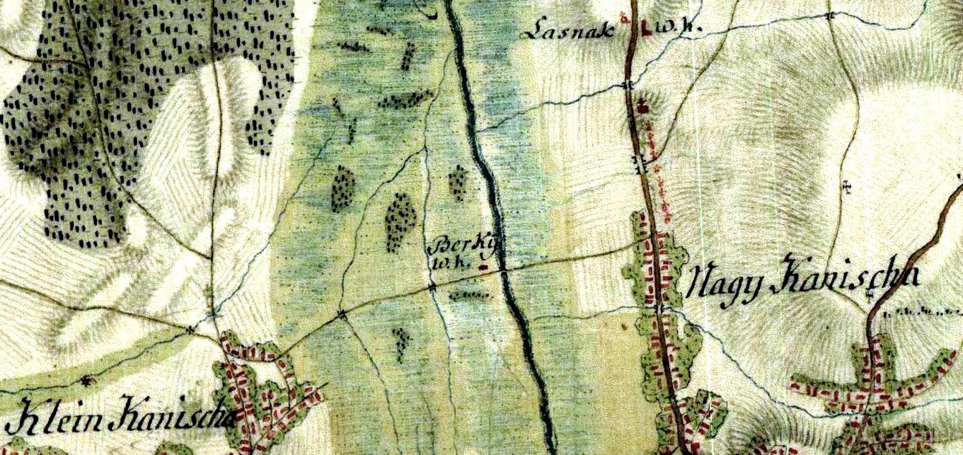 A patak hídjától nyugatra, az út északi oldalán az első katonai felmérés (az 1780-as évek első felében) jelzi a Berki vendégfogadó épületét.