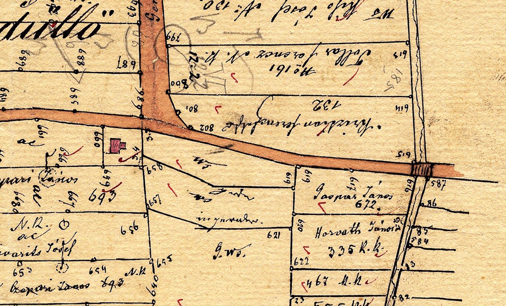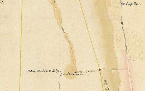 (A jobbra látható csatorna keleti oldala mentén ma a szombathelyi vasútvonal húzódik. Létezik az út észak-dél irányú elágazása is.)