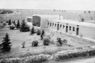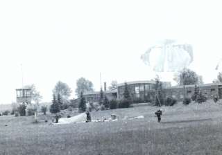 (A képen az épület reptér felé forduló oldala. Balra az irodák, középen a fogadócsarnok, jobbra a gépek személyzetének szállásai. Az épületet rá és az országútra merőlegesen rövid bekötőút kapcsolta a forgalomba. Ennek északi oldala mentén húzódó hasonló stílusú épületben volt a reptéri parancsnok illetve a hangármester szolgálati lakása.)