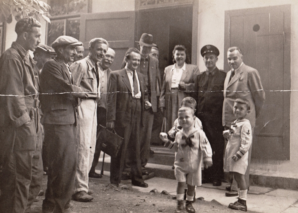 (Jobbra a polgármester Ligetvárosban, a három barakk átalakításával készült tizenhárom lakás átadásán, 1948-ban.)