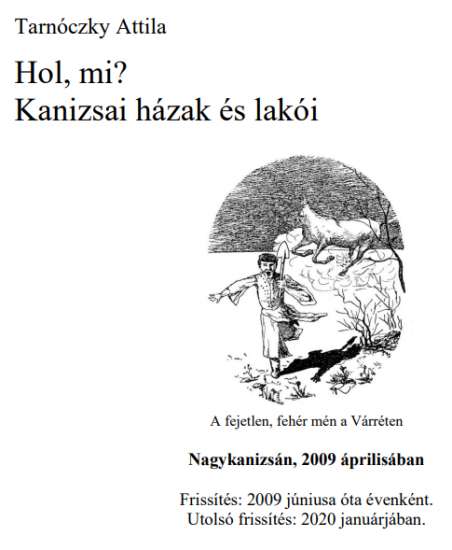 Ha szeretné az egész „Hol, mi? Kanizsai házak és lakói” 2020-as könyvváltozatát letölteni (több, mint 2500 oldal képekkel, illusztrációkkal, utcajegyzékkel, névmutatóval), kattintson az alábbi linkre, de vegye figyelembe, hogy a PDF fájl nagy, 350 Mbyte méretű!